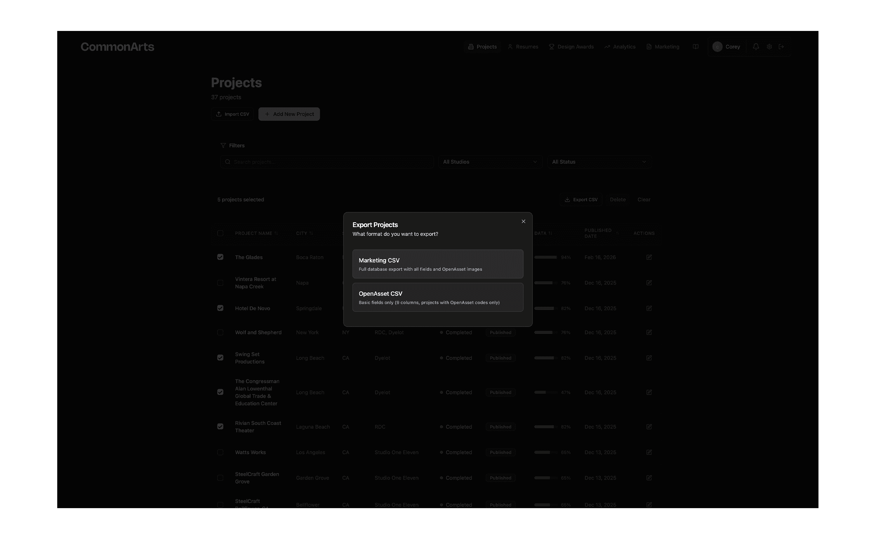 Select Projects → Export → Auto Populates Marketing Assets